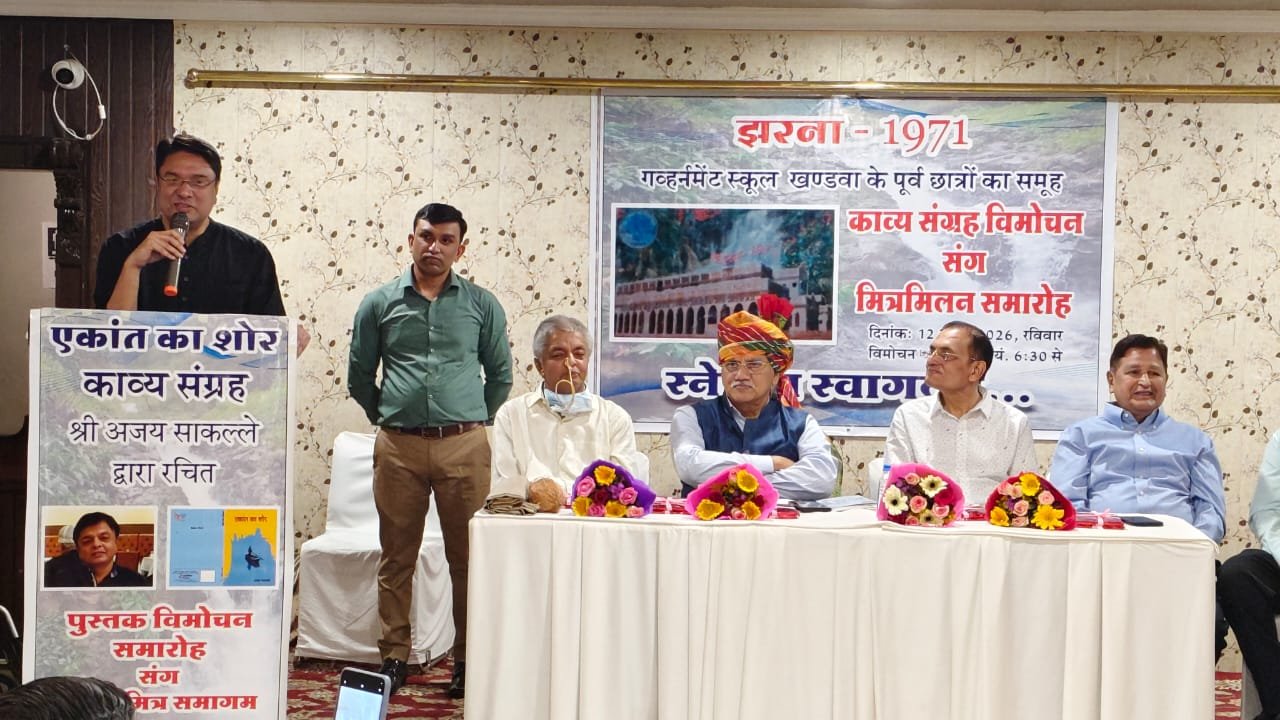 झरना71 ने अपने सहपाठी*अजय साकल्ले* के काव्य संग्रह को न केवल प्रकाशित किया है वरन यहाँ इंदौर में विमोचन हेतु सभी उपस्थित हुए है।हिंदी के वरिष्ठ कवि अजय साकल्ले के काव्य संग्रह”*एकांत का शोर* का विमोचन स्थानीय होटल में सम्पन्न हुआ।