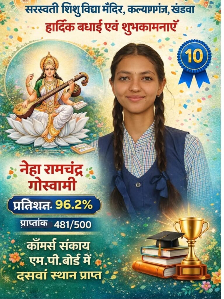 सरस्वती शिशु मंदिर कल्याणगंज खण्डवा की कक्षा 12वी की छात्रा नेहा गोस्वामी ने प्रदेश की सूची में दसवां स्थान बनाया