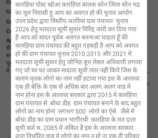 बृजेश कुमार रिपोर्टर सोनभद्र , कोन ब्लाक के दुरूह ग्राम पंचायत करहिया में त्रिस्तरीय चुनाव 2026 में मतदाता सूची गड़बड़ी…